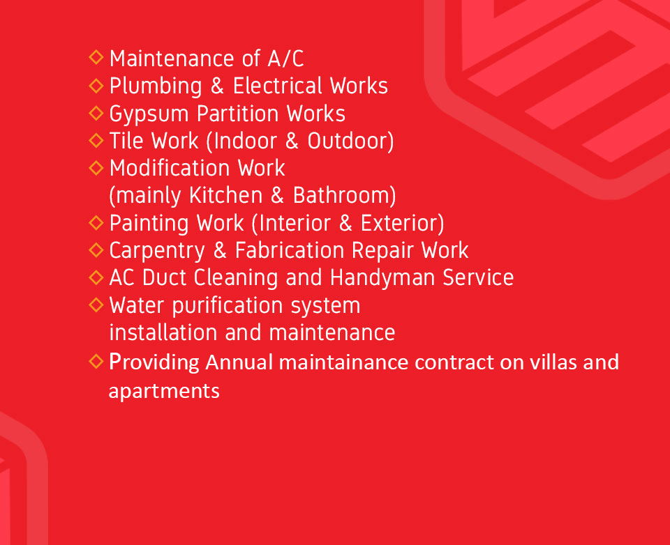We provide service like flexibility to call and pay us a competitive price only when there is a problem they face, also we provide Our customized complete annual maintenance contract to villas and apartments and commercial properties